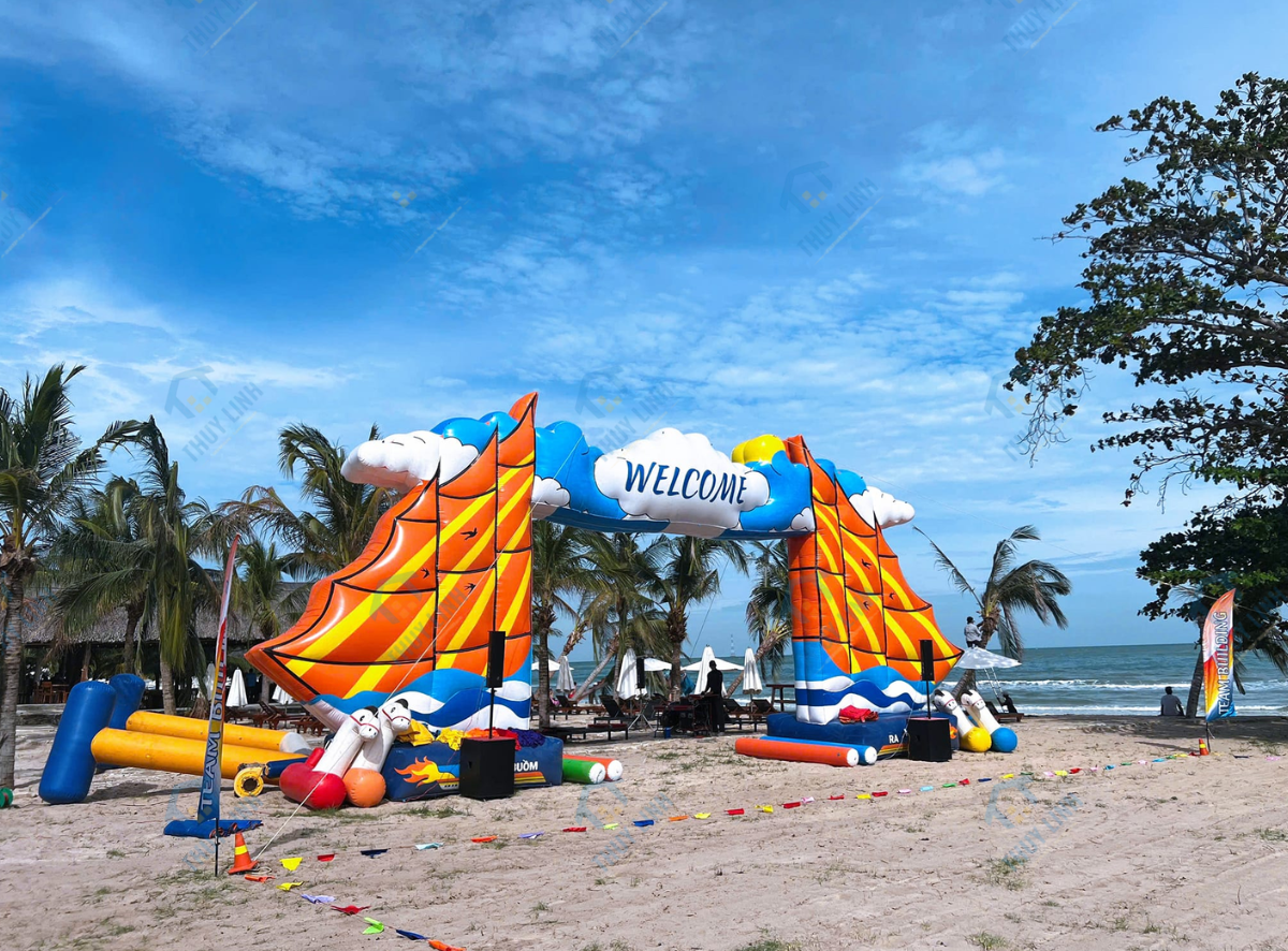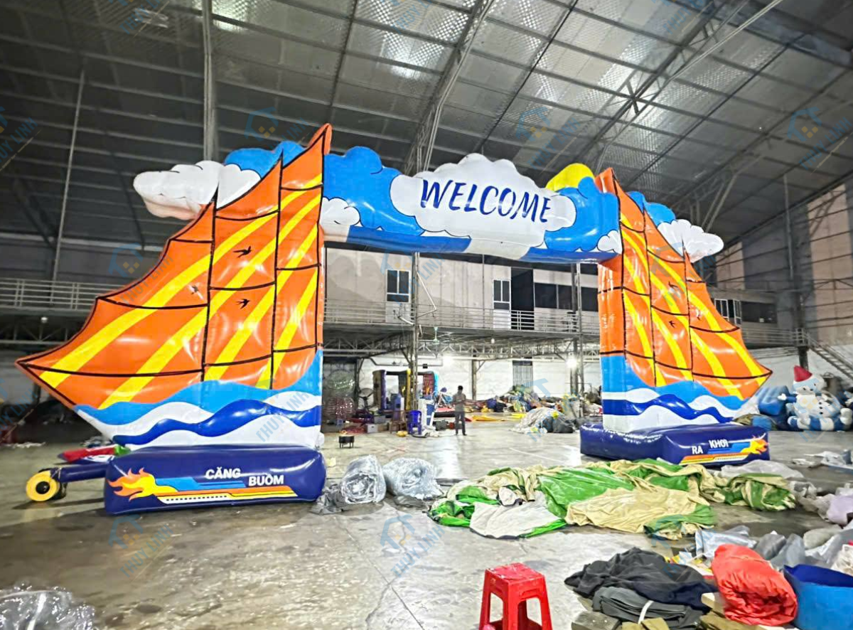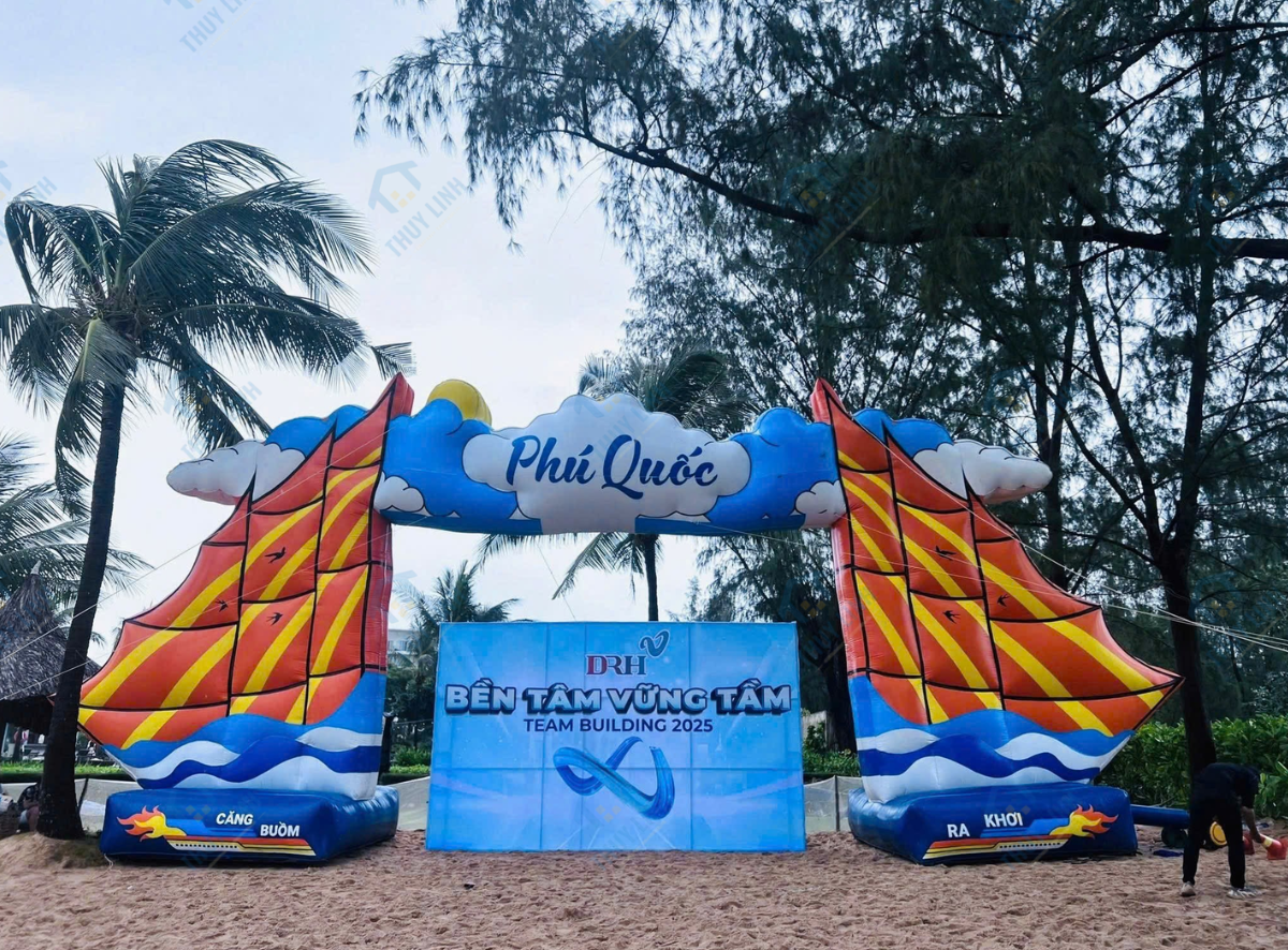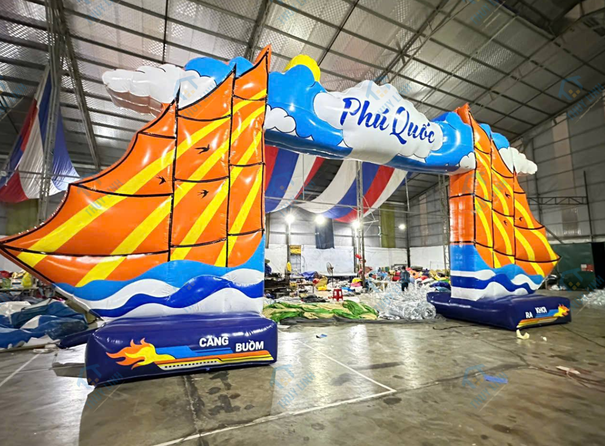 – Cổng hơi thuyền buồm teambuilding là mẫu cổng chào hơi được thiết kế với hình ảnh ấn tượng và mang đậm tính biểu tượng. Sản phẩm do Công ty Thùy Linh thiết kế và sản xuất, được bàn giao đến chủ sở hữu tại Phú Quốc, nhằm phục vụ cho các chương trình teambuilding với chủ đề gắn liền với biển cả và tinh thần đoàn kết.